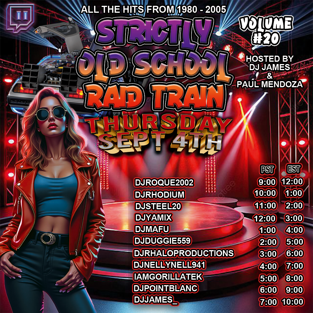OUR WEEKLY RAID TRAIN SHOWCASE DJS FROM ALL OVER THE GLOBEPLAYING 80’S 90’S EARLY 2000’S RNB’ HIP HOP’ HOUSE’ FREESTYLE ‘ FUNK’ DISCOWITH THE MIXTURE OF DIFFERENT STYLES OF MUSIC AND INTERACTIVE CHAT WITH MUSIC THAT BRINGS BACK MEMORIES SO JOIN US EVERY THURSDAY STARTING 12:00 PM EST TILL 12:00 AND YOU CAN SEE AND HEAR ALL THIS LIVE ON WWW.TWITCH.TVWATCH FOR UPDATES AND TIMES OF YOUR FAVORITE DJ